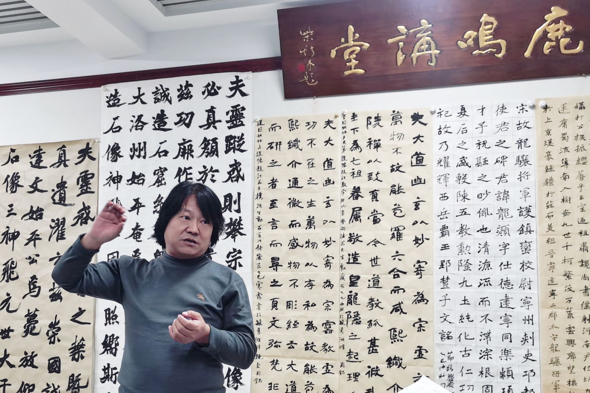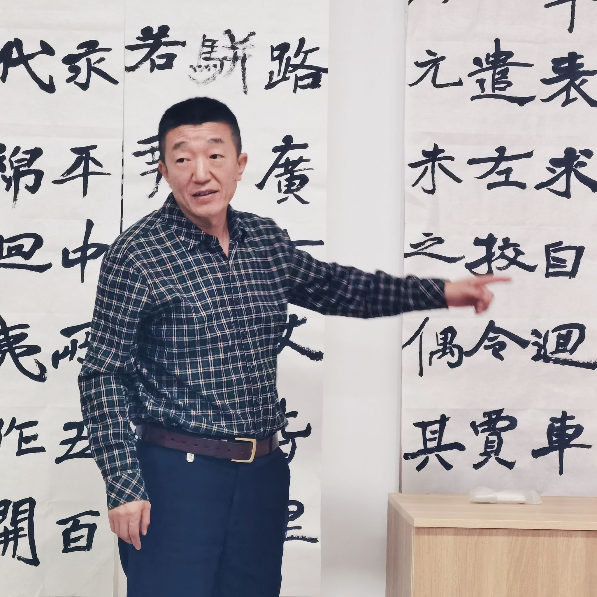 在作品互评环节,王建魁老师凭借深厚的专业积淀与丰富的教学实践经验,结合现场作品进行针对性评析。他提出两点核心建议:第一,明确实临与意临的辩证关系——实临时需精准提炼字帖的五至六个核心特征,确保对经典的忠实还原;意临则需在吃透实临特征的基础上,有意识地凸显2-3个个人感悟最深的特点,达到“入古出新”的目的。第二,针对当下书法学习中的“时风”问题,他指出,当代流行书风普遍存在“跨体融合”特征,无论楷书、行书,均不同程度融入隶书的波磔笔意与厚重质感,但这种风格对基础功底要求极高,建议学生应先扎根传统经典碑帖,以规范范本打牢基础,避免盲目跟风导致“揠苗助长”,丧失书法学习的本源根基。