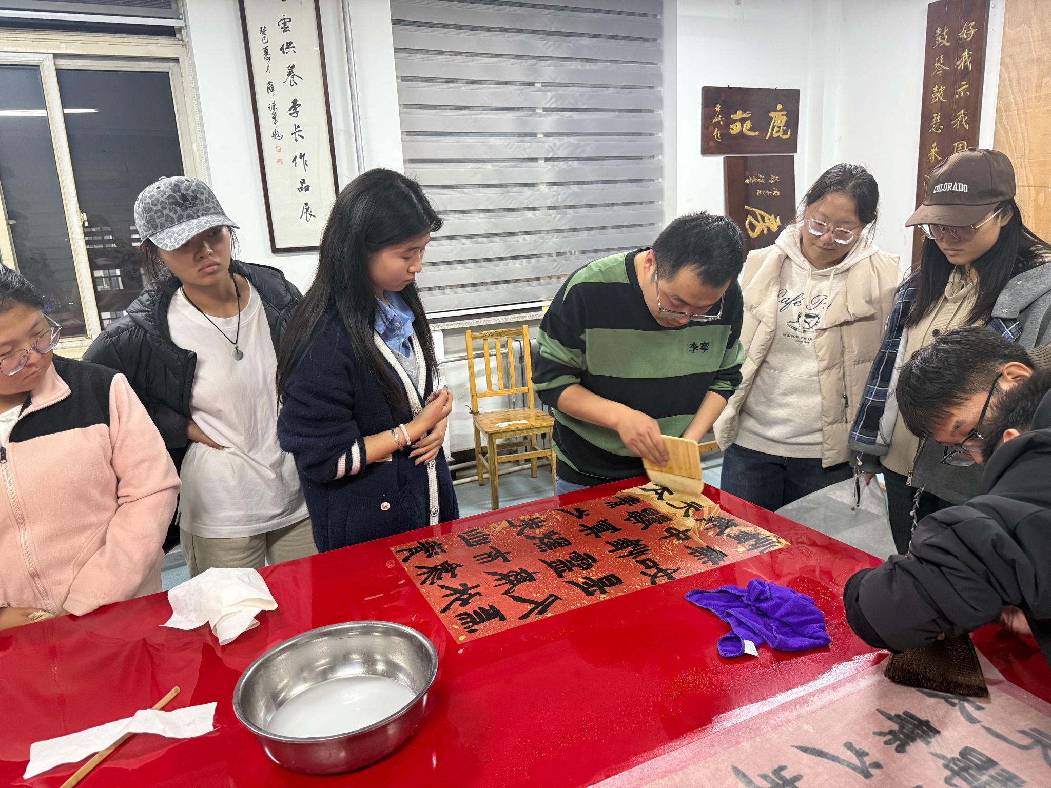 实操环节中,惠明涛老师首先亲自示范浆糊的调配方式,他一边熟练地操作着,一边耐心地向学生们传授经验。他特别指出,手工浆糊采用天然原料制作,不添加任何化学添加剂,能够最大程度地保护纸张和墨色不受损害,这是机器制作的浆糊所无法比拟的。同时,他还强调了浆糊浓稠度对装裱效果平整度的直接影响,让学生们明白每一个细节都关乎最终的成品质量。随后,惠老师全过程示范了湿托、飞托、搭托等不同的技艺,并详细讲解了每种技艺的适用场景。随后在惠明涛指导下学生进行现场操作练习,惠明涛不时亲手校正学生持刷、提画姿势,同学们按照步骤小心翼翼地操作——托心、上浆、排气、上墙,每一道工序都做得一丝不苟。