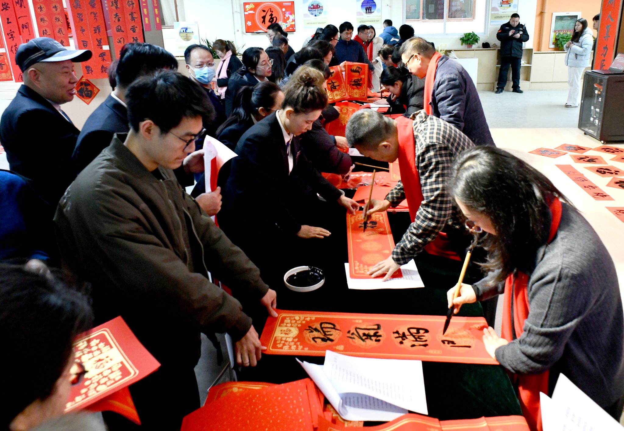 师生以及书法爱好者一同挥毫泼墨,精心书写寓意吉祥的春联、遒劲有力的“福”字以及励志劝学的经典楹联,并将作品赠予在场师生,以传统书法艺术传递新春祝福与暖心敬意。